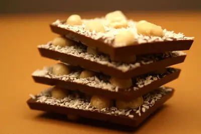 Belgian milk chocolate coconut macadamia tiles. Three Tiles sprinkled with fresh coconut and macadamia nuts.